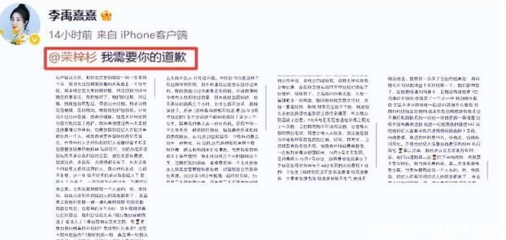 月中的时候中戏的一个毕业生李禹熹在社交平台发布了一则长文。文章开头几个大字指名道姓要求荣梓杉给自己道歉。从她的字里行间我们了解到了两个人的感情史,相识一个月就确认关系。然而还没爱多久荣梓杉就对她进行冷暴力。