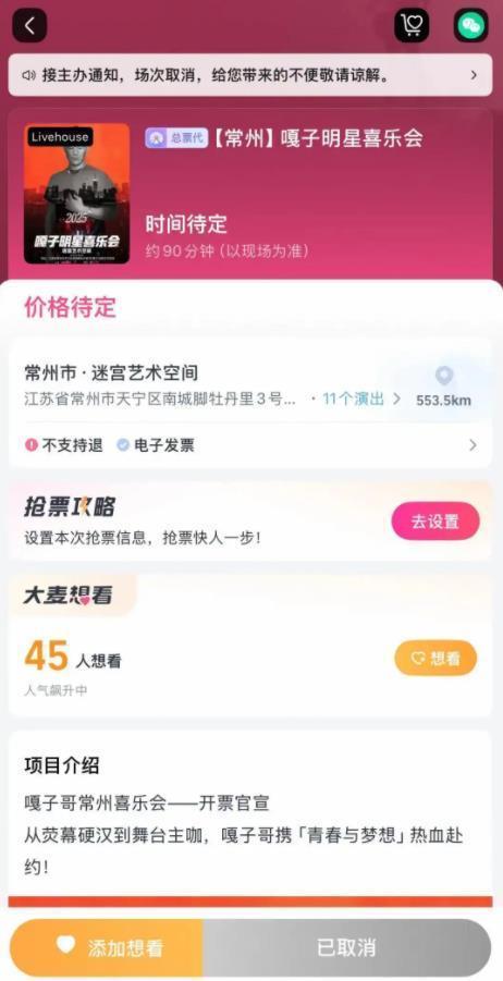 此前,第三方票务平台显示,常州“嘎子明星喜乐会”在11月15日举行,票价有98元、168元、268元和666元四个档位,268元可以获得1V5合影,666元可以获得1V1祝福视频,观众规模限定900人。