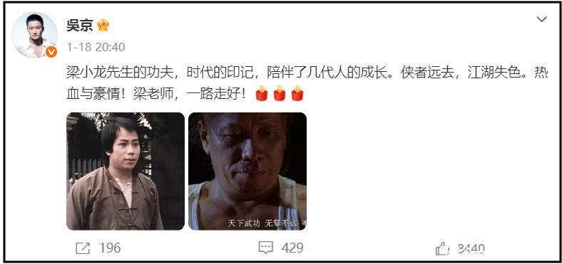 作为著名的功夫影星,梁小龙去世后引发了全网悼念,娱乐圈人士更是纷纷发文悼念,可以看到成龙、周星驰、吴京、李力持、杨丽菁等人都发声悼念。