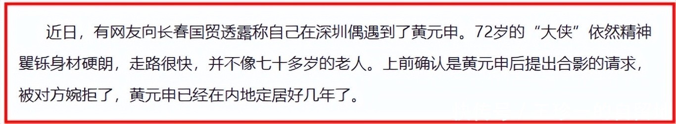 到了2020年,有网友向知名博主“长春国贸”爆料在深圳偶遇了黄元申,直言他精神矍铄、身材硬朗,走路很快,不像七十多岁的老人。