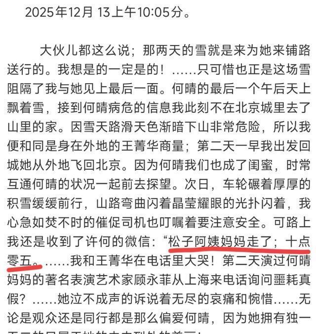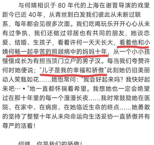 当何晴闺蜜的哀悼文曝光后,我们才知道许何小小年纪就离家的原因,这次许亚军仅剩的“体面”都丢光了! 离家原因不简单 徐松子算是何女士好多年的老朋友了,之前总是来照顾她,包揽所有的家务活让何女士非常的感动, 在生病的时候能有这样雪中送炭的人真是太难得了,在何女士走后,徐松子也发布了悼念文,